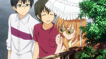 柳澤に彼女ができたのでは!? という疑惑から、千波の家の前で張り込む万里と香子と二次元くん。